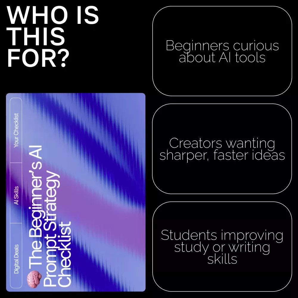 This checklist is ideal for anyone curious about using AI effectively—beginners exploring ChatGPT or similar tools, creators who want better content, students looking to learn faster, or entrepreneurs who want to save time and spark new ideas. It’s a practical ai prompt strategy for beginners that turns curiosity into skill in minutes.