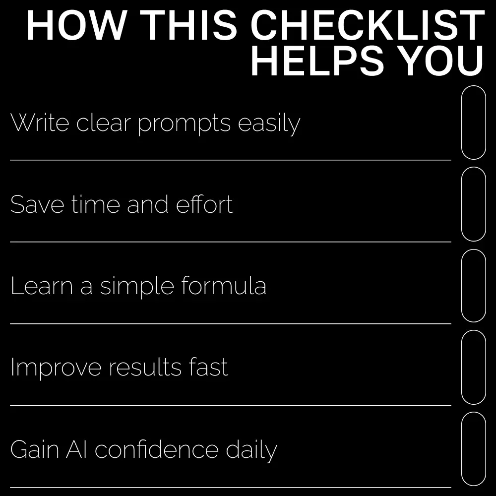 Unlike complex guides or technical manuals, this checklist is designed to be direct, visual, and fun to use. Each section gives you actionable steps and examples you can apply immediately. It’s not just theory—it’s a hands-on tool that helps you master AI prompting fast and confidently.