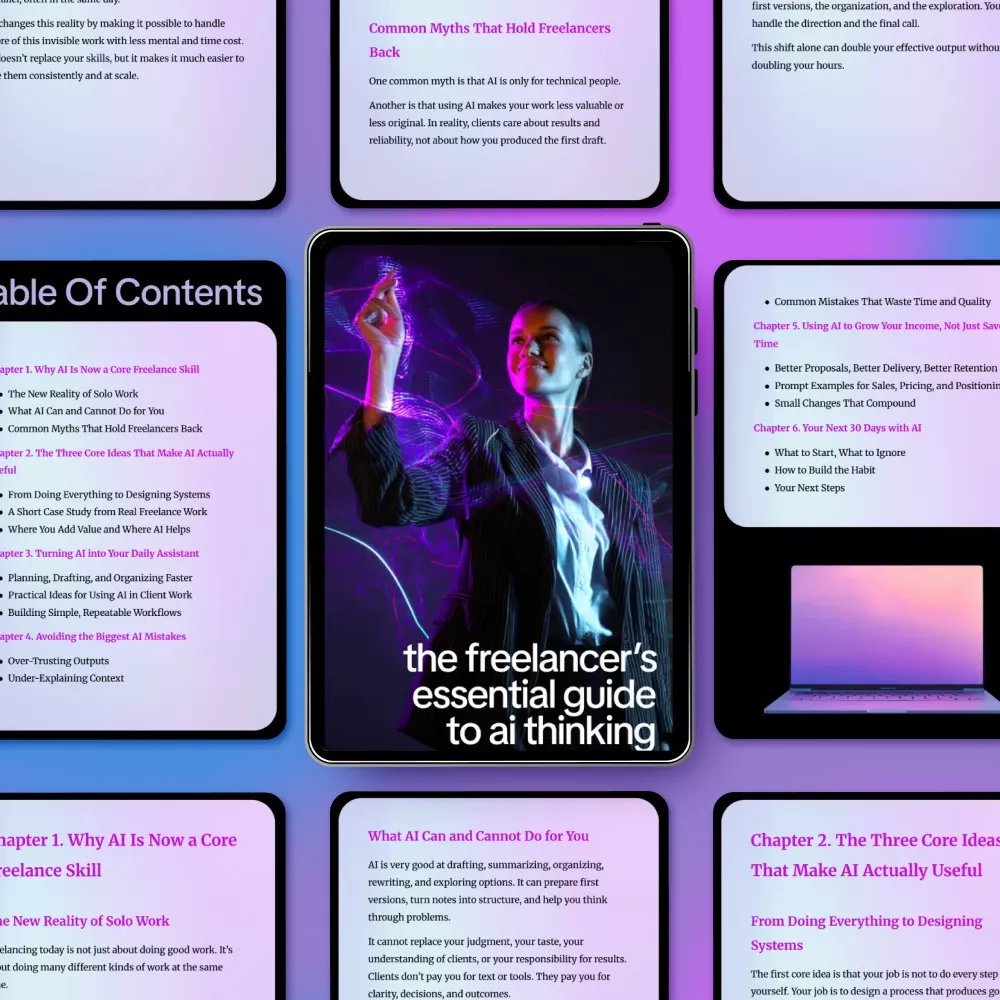 Most AI resources focus on tools that quickly become outdated. This guide focuses on thinking. By understanding how to design work around AI, you stay adaptable no matter which tools change next. It’s written from real freelance experience, not theory.