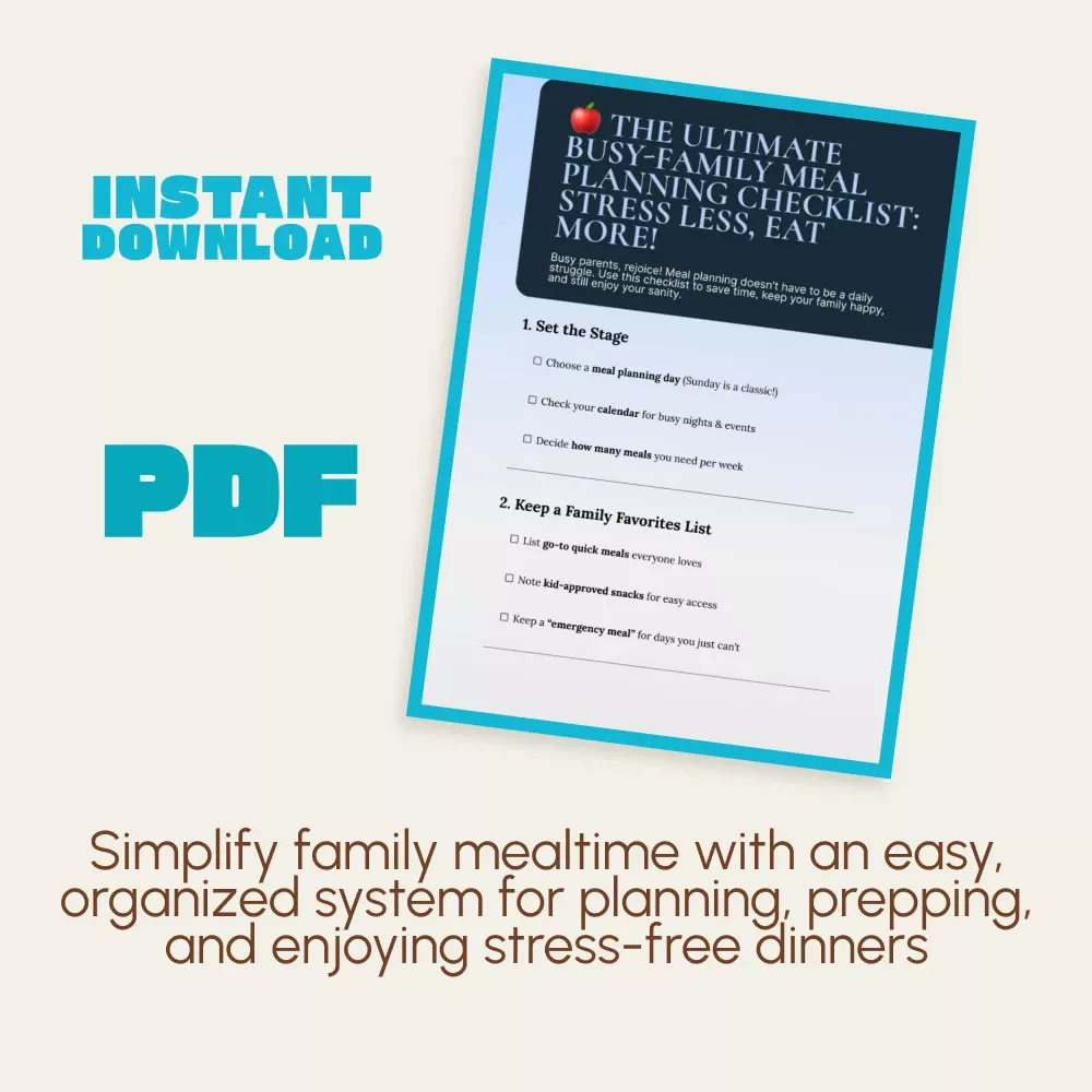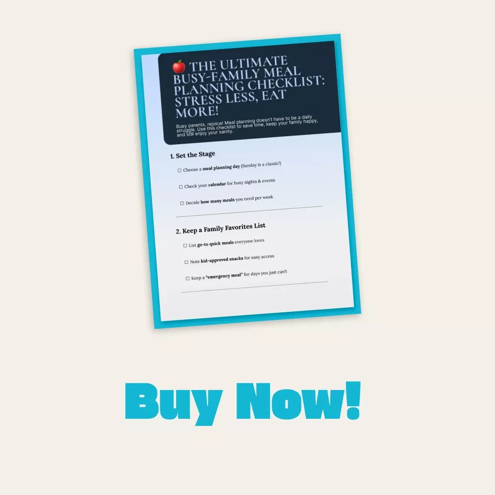Transform your weeknights with The Ultimate Busy-Family Meal Planning Checklist: Stress Less, Eat More! Download it instantly, print it out, or keep it on your device. Start planning smarter, saving time, and eating better—because your family deserves meals made with more joy and less stress. Click “Add to Cart” to grab your copy now!
