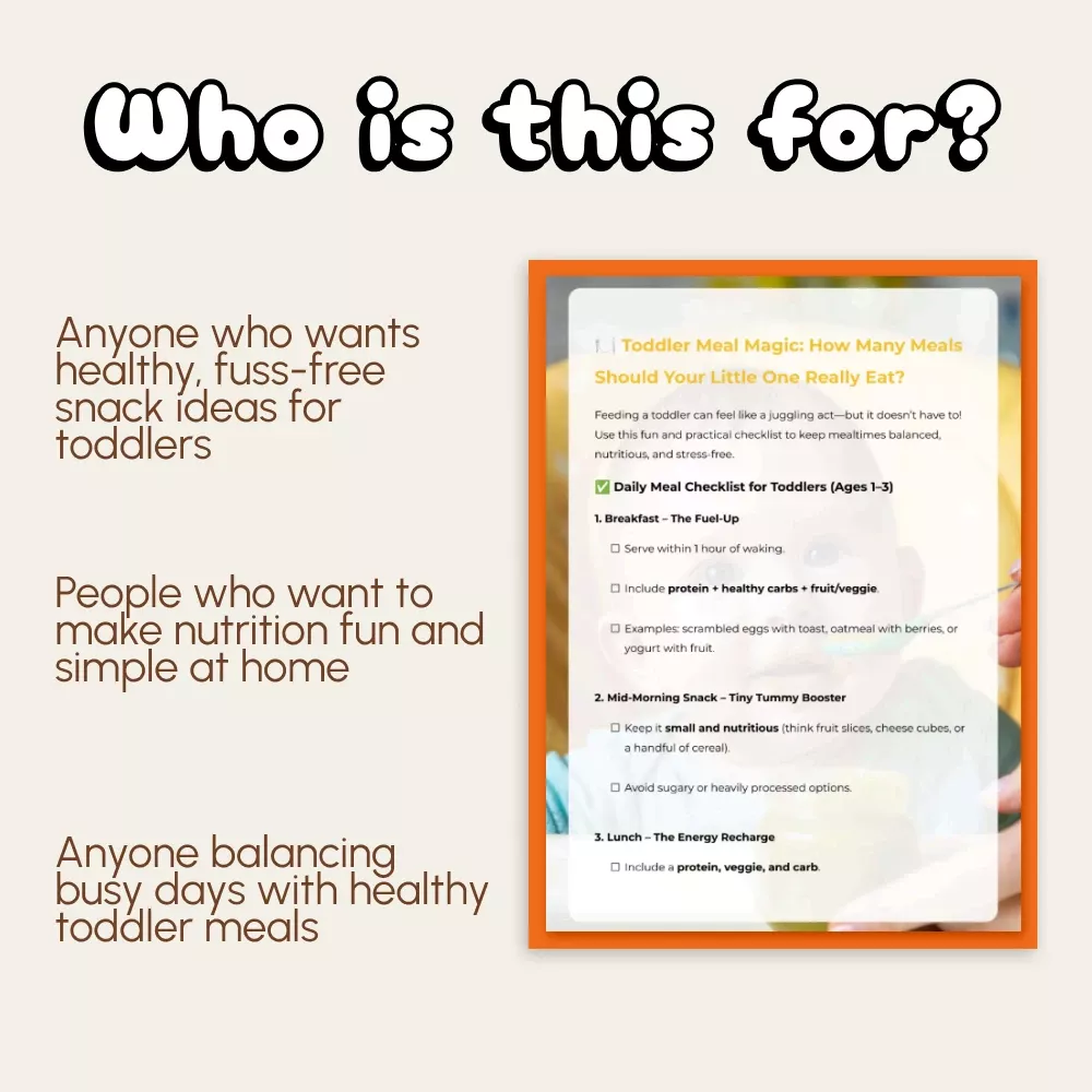 This digital checklist is perfect for parents, caregivers, and anyone caring for toddlers aged 1–3 who want snack time to be both healthy and fun. It’s ideal for those seeking inspiration beyond sugary, packaged snacks — and who value real, wholesome food options their kids will actually eat.