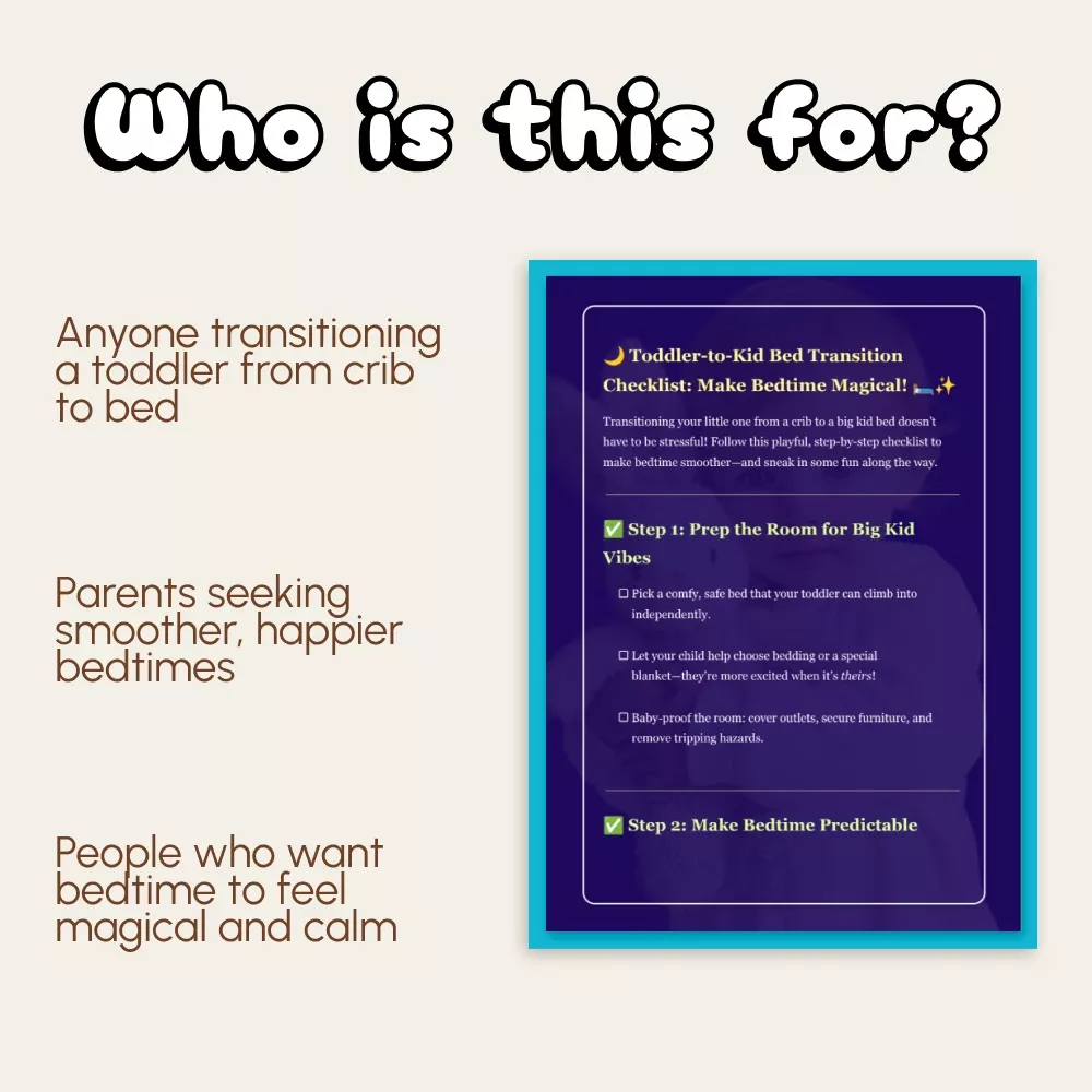 This digital checklist is designed for parents, caregivers, and families ready to help toddlers confidently make the leap to their “big kid” bed. It’s ideal for busy moms and dads who want a calm, positive approach without hours of research or guesswork.