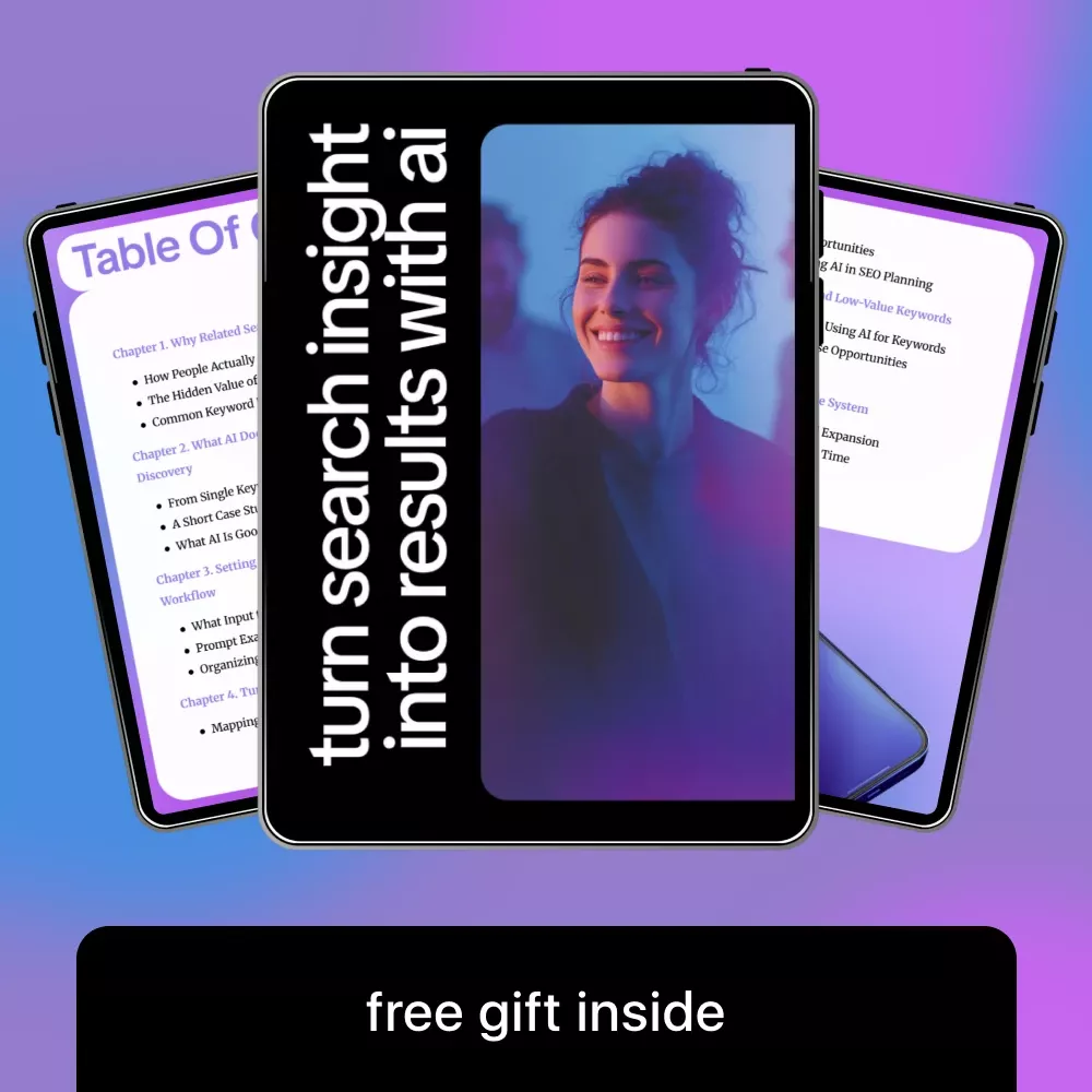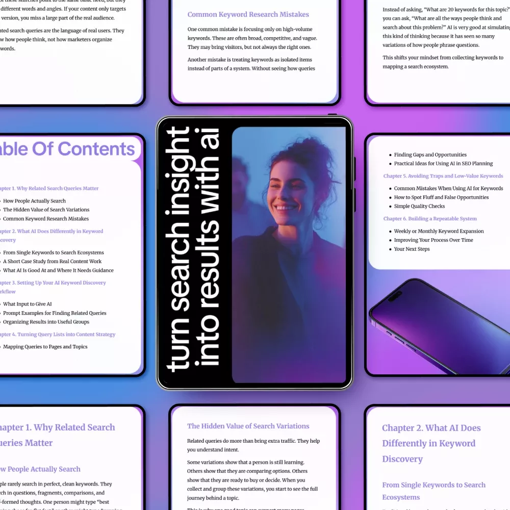 This isn’t just another keyword guide. Turn Search Insight Into Results With AI combines real-world examples, step-by-step workflows, and practical advice to teach you exactly how to use AI to find related search queries. Unlike generic resources, it focuses on actionable strategies, avoiding fluff, and creating a system you can repeat for ongoing success. With clear explanations and hands-on prompts, it’s ideal for anyone who wants to integrate AI into their SEO planning efficiently and effectively.