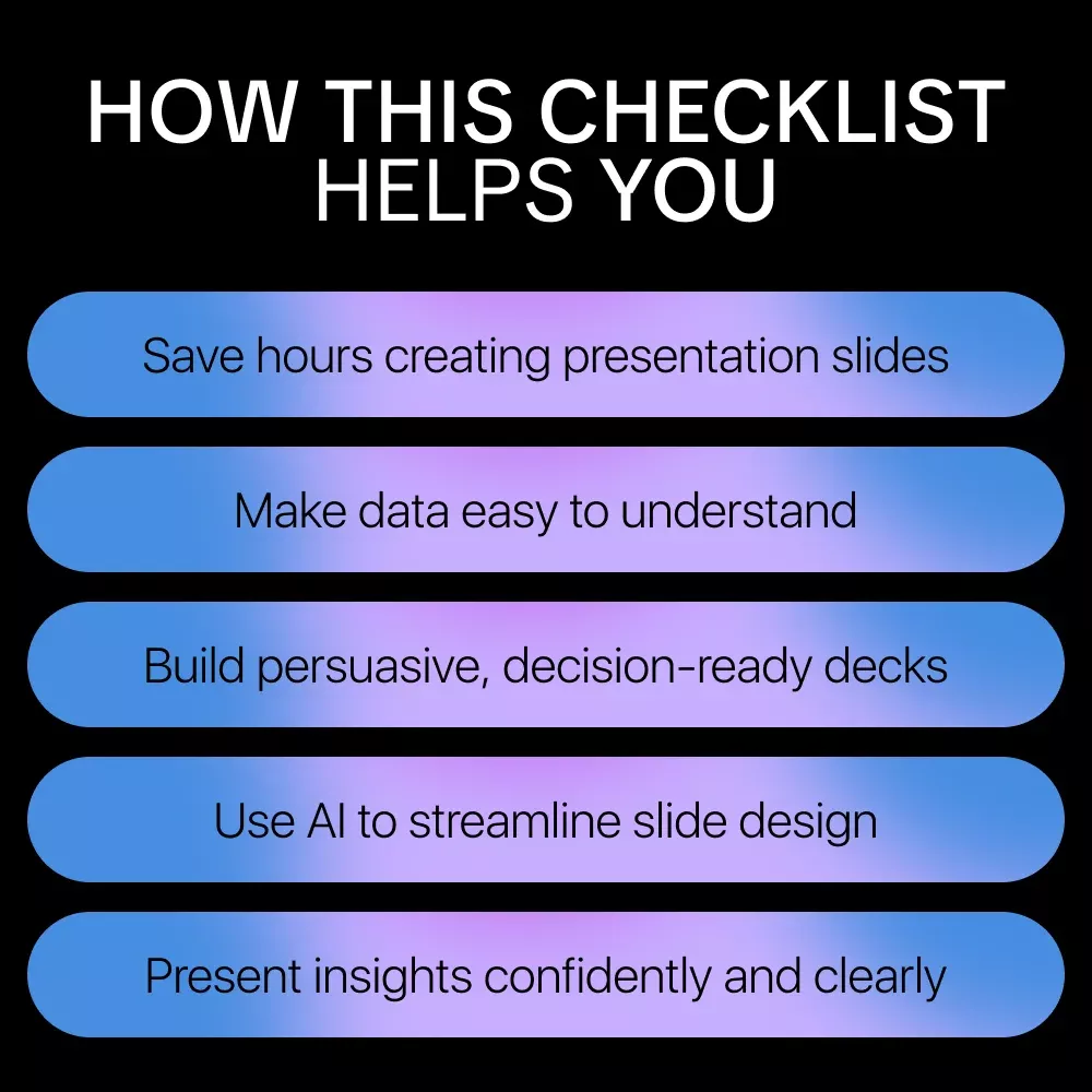 Stop struggling with slides and let AI do the heavy lifting while you focus on strategy and delivery. Grab your digital checklist today and start creating presentation slides that impress, inform, and drive action.