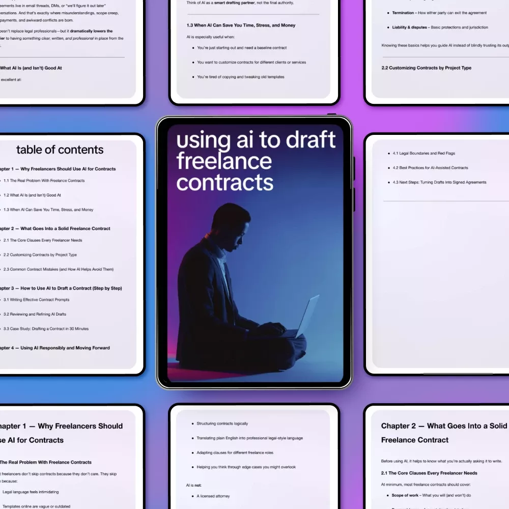 If you’re ready to stop overthinking contracts and start using AI with confidence, this guide is for you. Download Using AI to Draft Freelance Contracts today and build a smarter, more efficient freelance workflow—starting with agreements that protect your time, income, and peace of mind.