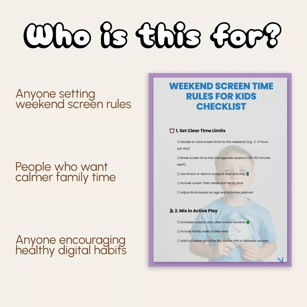 Unlike other screen time guides, this checklist combines practical time management tools with family connection strategies. It’s visually clear, easy to print or use digitally, and focuses on empowerment—not restriction. You’ll feel confident setting screen time rules for weekends that your kids can understand and follow happily.