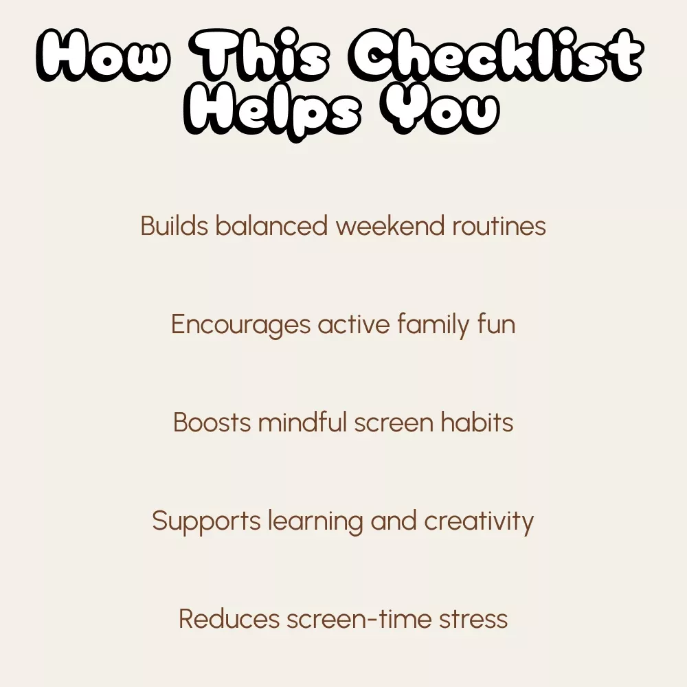 This checklist is perfect for parents, caregivers, and educators who want to promote healthy digital habits while keeping weekends fun and connected. Whether you have young kids or teens, this guide adapts easily to your family’s lifestyle and screen goals.
