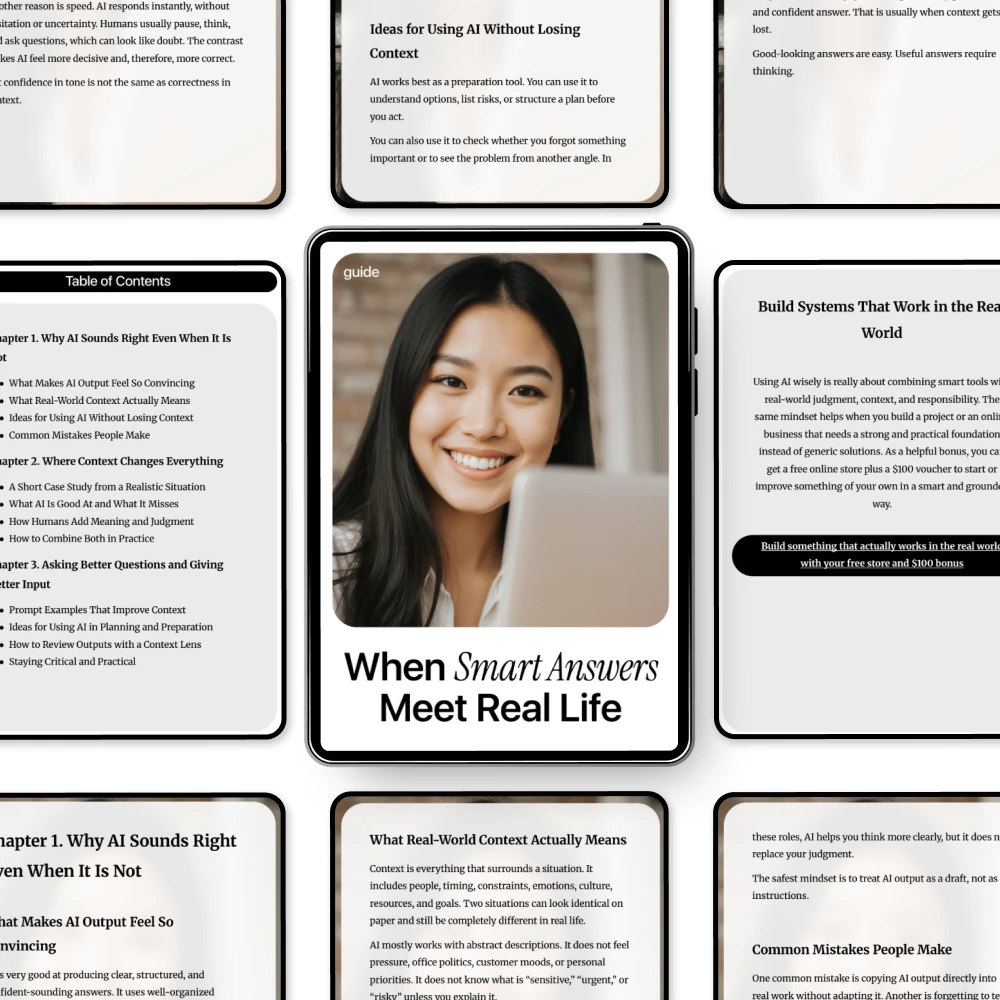 Ever felt confident about an AI-generated answer only to realize it doesn’t fit the real-world situation? When Smart Answers Meet Real Life is a comprehensive digital guide designed to help you bridge the gap between AI output vs real world context. This practical guide walks you through why AI sounds right even when it isn’t, how context changes everything, and how to use AI thoughtfully without losing sight of real-world meaning. Perfect for professionals, students, and tech enthusiasts, it equips you with actionable strategies to make AI work for you in practical, context-aware ways.