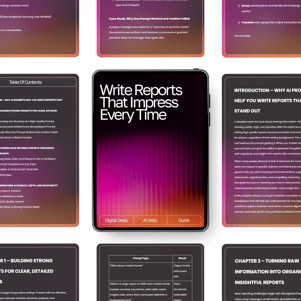 Unlike generic AI writing guides, this resource goes beyond surface-level advice. It teaches you how to think like a report strategist — not just a writer — using actionable frameworks, real-world examples, and tailored ai prompts for detailed reports that ensure professional-quality results every time.