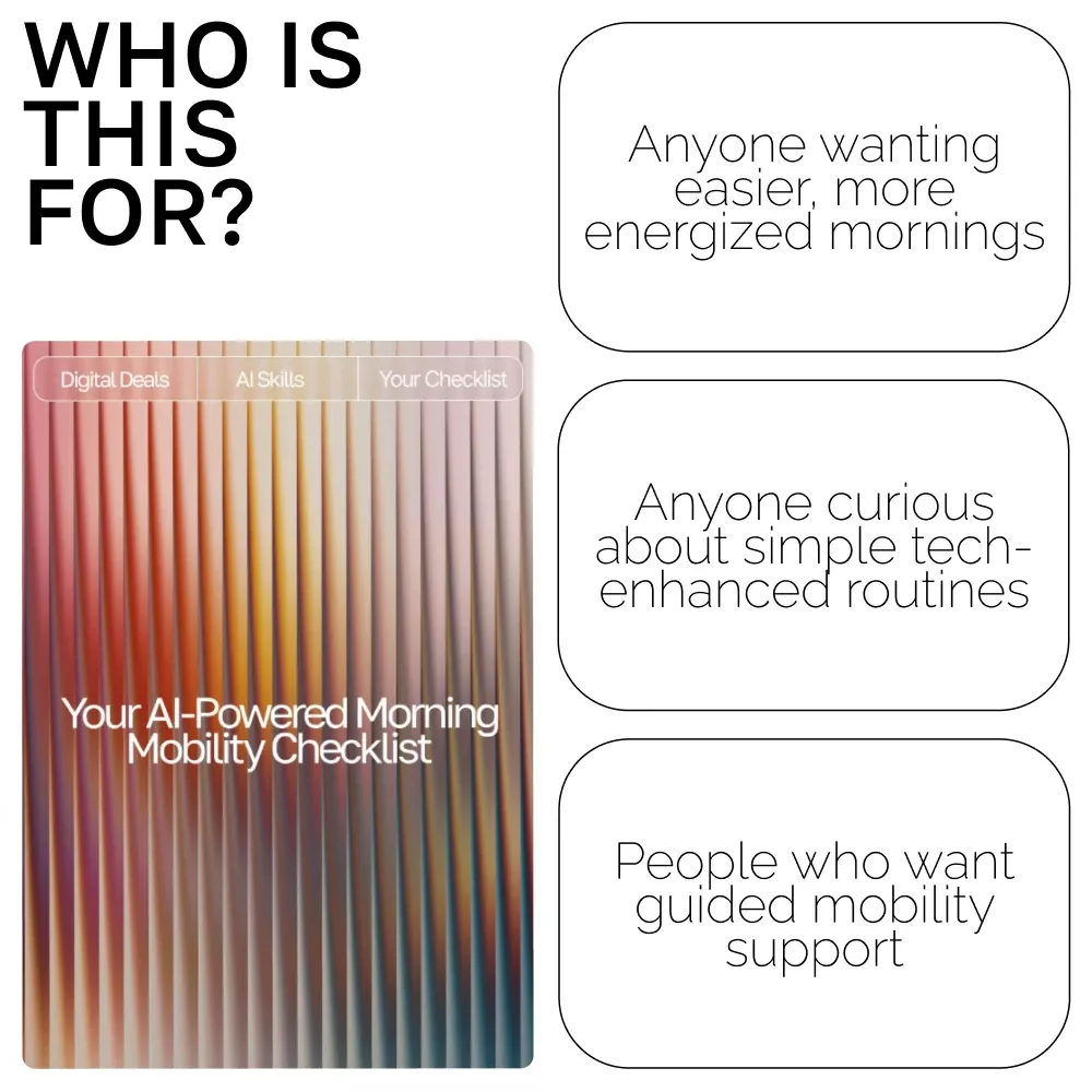 This checklist is ideal for anyone wanting an easy, uplifting way to improve their mornings. It’s especially helpful for people who love blending wellness with technology, or who want fresh ai ideas for morning mobility routines to guide them without overwhelm.