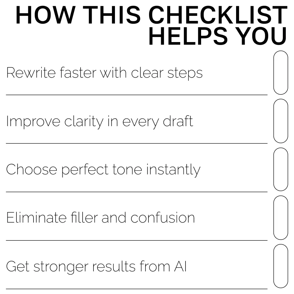 Unlike generic AI writing guides, this checklist is built specifically around practical workflow steps you can apply instantly. It combines clarity, structure, and actionable direction so you can generate polished rewrites every time—without overwhelm, guesswork, or messy results. It also integrates the essential concept of ai prompts for rewriting text clearly in a natural, accessible way.