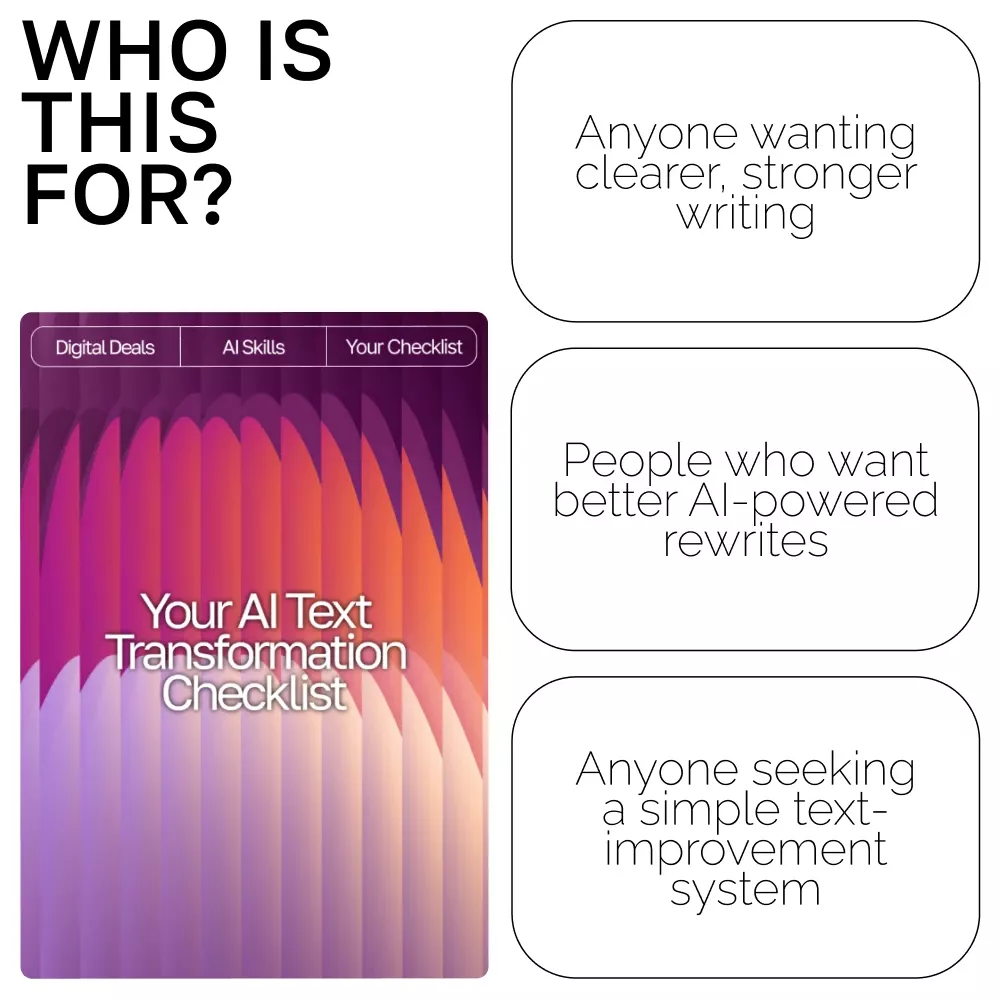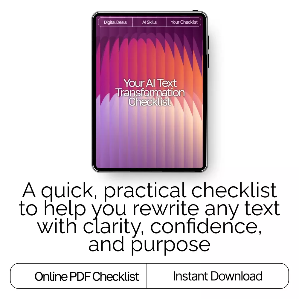 Download Your AI Text Transformation Checklist today and start creating clearer, sharper, more compelling rewrites with ease. Perfect for instant use—add it to your workflow now and watch your content evolve.